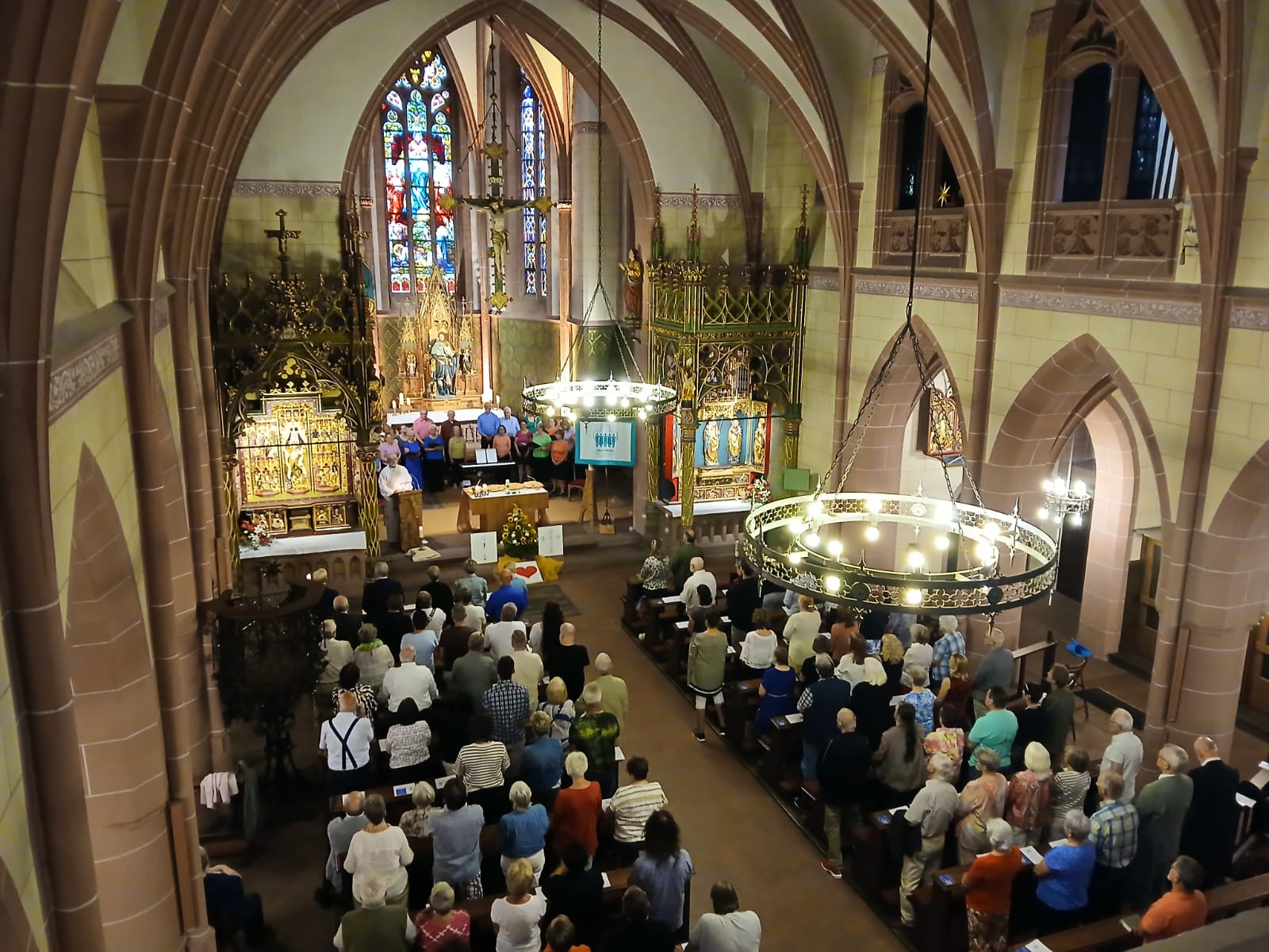 Die Feierlichkeiten begannen mit einem beeindruckenden Gottesdienst in der wunderschönen Rochuskapelle, der von unserem geistlichen Beirat Martin Huber gehalten und von den Amen Singers aus Bingen musikalisch begleitet wurde. Drei vor dem Altar aufgestellte Plakate mit den Symbolen für Glaube, Hoffnung und Liebe wiesen bereits auf das Thema dieser ökumenischen Feier hin. Glaube ist das Fundament des Lebens, Hoffnung der Anker und Liebe ist Alles.